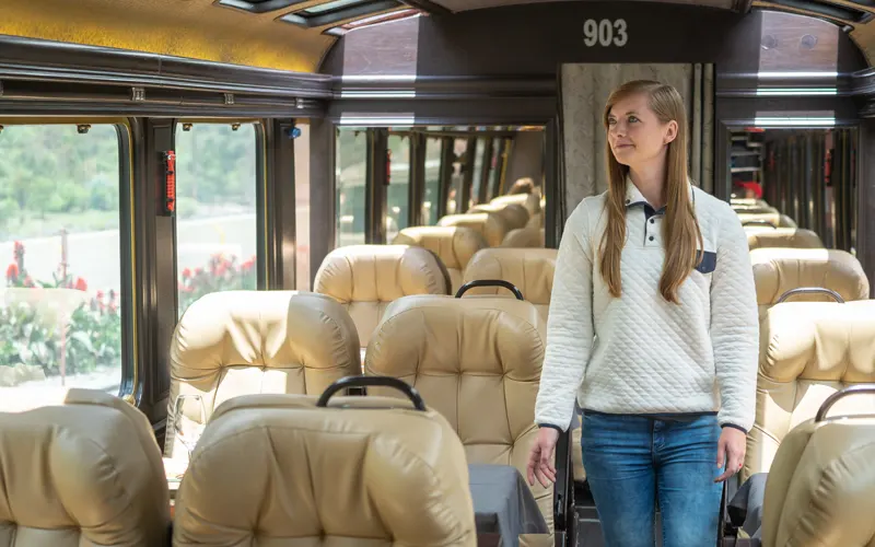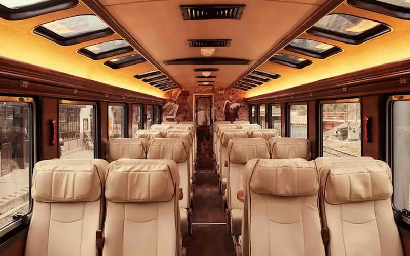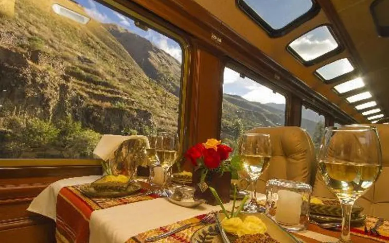 “The First Class” offers a luxury train service with finely decorated carriages, panoramic windows, comfortable seating, live music, a gourmet 3-course menu, a bar, and an outdoor balcony to enjoy the natural and cultural beauty. It also includes private transportation from Machu Picchu Pueblo to the Citadel.